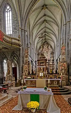 Das alte Chorgestühl stammte von Melchior Binder aus dem Jahr 1593. Die davon erhaltenen Reste sind heute am Westende der Seitenschiffe aufgestellt. Bemerkenswert ist an ihnen die eigenständige Verknüpfung der spätgotischen Formsprache mit antikisierenden Elementen, wie sie in der italienischen Renaissance üblich waren.