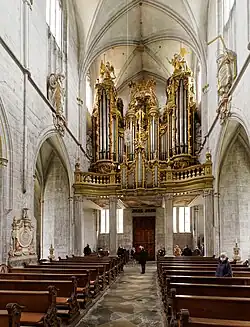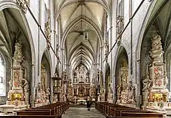 Mittelschiff und Seitenschiffe sind von gotischen Kreuzgewölben überdeckt. Das Gewölbe des Langhauses wird von Stützen getragen, die in einer asymmetrischen „Eisbrecherform“ ausgebildet sind: Zum Laienraum hin präsentieren sie sich als rechteckige Pfeiler, deren wuchtige Gestalt durch schlanke Säulenbündel gemäßigt werden; zu den Seitenschiffen hin schließen sie spitzwinklig ab, wodurch das Gewölbe leichter und die Seitenschiffe geräumiger wirken. Die Pfeiler wurden aus Gründen der Statik weit in die Tiefe gezogen und ersetzten so besondere Strebebögen an der Außenseite. Durch diese Bauweise entstanden zwischen den Pfeilern Räume für kleine Seitenkapellen, die wiederum mit Kreuzrippen überwölbt sind, wodurch der Eindruck eines zusätzlichen Seitenschiffs entsteht.