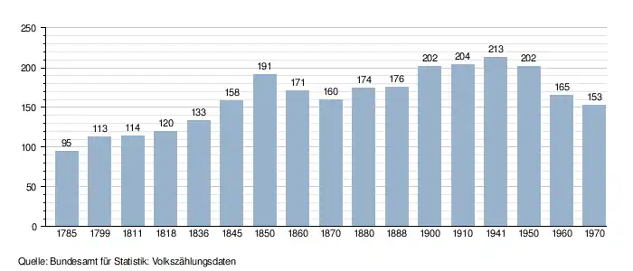 - ↑ Daten der Eidgenössischen Volkszählungen ab 1850 nach Gemeinden. (XLSX; 10 MB) Bundesamt für Statistik, Neuchâtel, 12. Juli 2024, abgerufen am 15. Mai 2025 (Öffnung in Excel nur über "Anhang/Excel-Datensatz" möglich).