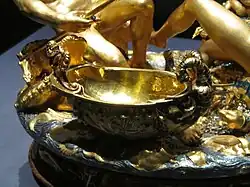 Die Saliera gilt als die einzige erhaltene Goldschmiedearbeit Benvenuto Cellinis (1500–1572).[1] Sie ist ein Werk der Spätrenaissance und zeigt eine allegorische Darstellung, in deren Zentrum zwei antike Göttergestalten stehen: Auf der einen Seite lagert Neptun, der Gott des Meeres, mit einem Dreizack bewaffnet. In der Form eines Schiffes öffnet sich zu seiner Rechten ein Salzbehälter. Dieses wird von vier pferdeartigen Wesen mit Rossleib und Fischschwänzen getragen. Ihm gegenüber sitzt Tellus, die römische Göttin der Erde. An ihrer Seite befindet sich ein Tempelgebäude, das als Behälter für Pfeffer dient. Weiter sind Landtiere zu erkennen und ein von Blüten und Früchten strotzendes Füllhorn.