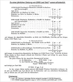 Im Archivgut ist der Bericht des Administrators auf der Königlichen Saline Staßfurt namens Backe[13] enthalten, welcher beinhaltet: „Die Feuerung bestand bis zum Jahre 1800 in Holz, da aber dieses immer theurer wurde und nicht mehr anzuschaffen war, so bedient man sich seit dieser Zeit der Stein- und Braunkohlen. Nur zum jedesmaligen Feuermachen wird Langstroh und Wellen genommen.“ („Welle“ hat hier die Bedeutung „Reisigbündel“.)[14] Zu einer Last Salz waren erforderlich: 1 Stück Welle, 12 Scheffel Steinkohlen sowie 32 Scheffel Braunkohlen. Die notwendige Menge an Heizmaterial für eine jährliche Siedung von 2000 Last zeigt nebenstehende Tabelle.
