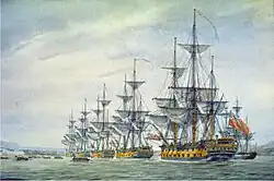![]() – Gemälde von Irwin John Bevan – Die Centurion, in der Mitte der Linie und weitere Schiffe beim Angriff auf Rhode Island.