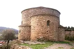 - Unmittelbar daneben steht die Ende des 20. Jahrhunderts restaurierte romanische Rundkirche Sant Esteve i Sant Sebastià mit ihren drei Apsiden, die – als einzige Bauzier – unterhalb der Dachtraufe mit Rundbogenfriesen abschließen. Wahrscheinlich handelt es sich um die ehemalige Burgkapelle, doch man könnte auch an eine Kirche des Templerordens denken – in jedem Fall ist es für Katalonien – mit Ausnahme der deutlich kleineren Kirche von Vilanova bei Santa Maria d’Oló – ein nahezu einzigartiges Bauwerk.