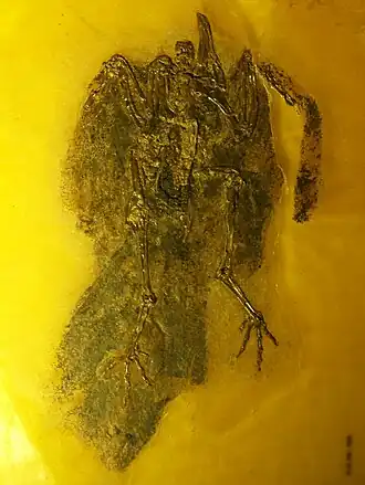 Fossil von Salmila robusta mit gut erkennbarem Abdruck der Befiederung aus der Grube Messel im Senckenberg Naturmuseum in Frankfurt.