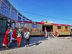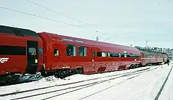 Das Königshaus von Dänemark hat einen eigenen Salonwagen, der 1979 gebaut wurde.[124] In der Praxis wird das Fahrzeug heute nur noch selten eingesetzt. Zum dänischen Hofzeremoniell gehört es, dass verstorbene Monarchen mit einem Sonderzug von Kopenhagen nach Roskilde überführt werden, wo sie im dortigen Dom traditionell ihre letzte Ruhestätte finden. In diesen Zügen wird auch immer der aktuell eingesetzte königliche Salonwagen für die Königsfamilie mitgeführt.[125] Mehrere ehemalige dänische königliche Salonwagen sind im Dänischen Eisenbahnmuseum in Odense ausgestellt:
