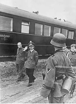 Während im Kaiserreich die bahndienstlichen Regelungen zu Fahrten von Salonwagen zahlreich waren, bricht dies 1918 komplett ab. Erst während des „Dritten Reichs“ war das wieder Thema.[55] Mindestens 78 Salonwagen und andere Begleitfahrzeuge[56][57] für Sonderzüge wurden nach 1934 für Adolf Hitler, Hermann Göring und andere Funktionäre des „Dritten Reichs“ in Dienst gestellt.[58][59][60] Adolf Hitler beauftragte namhafte Architekten jener Zeit zur Einrichtung seiner Salonwagen. Die Wagen wurden von allen großen Waggonfabriken des Reiches hergestellt u. a. Wegmann & Co., Westwaggon. Die Salonwagen 10201 bis 10204 waren mit Behältern ausgestattet, mit denen Telegrammtexte bei der Durchfahrt auf Bahnhöfen abgeworfen und vom dortigen Bahnpersonal dann versandt werden konnten.[61] Der Sonderzug „Asien“ von Hermann Göring bestand aus 15 Fahrzeugen, unter anderem dem Salonwagen 10205.[62] Auch andere politische Führer und führende Militärs des „Dritten Reiches“ konnten komplette Sonderzüge nutzen.[63] 1941 wurden der Wehrmacht für die Bereitstellung eines Salonwagens täglich 63,00 RM berechnet.[64]
