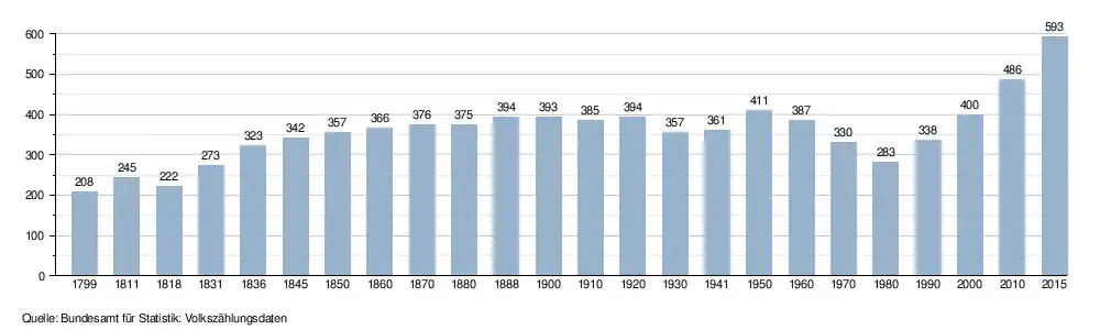 - ↑ Daten der Eidgenössischen Volkszählungen ab 1850 nach Gemeinden. (XLSX; 10 MB) Bundesamt für Statistik, Neuchâtel, 12. Juli 2024, abgerufen am 5. September 2025 (Öffnung in Excel nur über "Anhang/Excel-Datensatz" möglich).