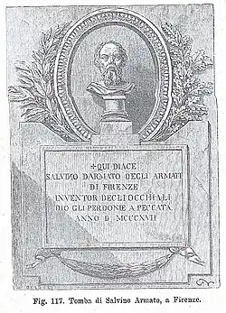 („Hier liegt Salvino d’Armato degli Armati aus Florenz, der Erfinder der Augengläser. Möge Gott seine Sünden vergeben. Anno Domini 1317“)