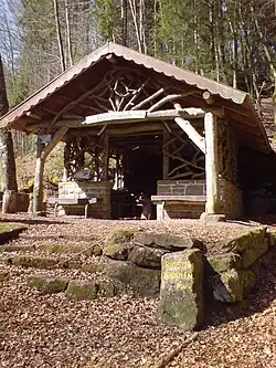 Nahe beim Klosterbrunnen (⊙), wo der linke Salzbach-Zufluss Bach von der Klostersalzquelle entspringt, stehen die 1911 vom Pfälzerwald-Verein, Ortsgruppe Lemberg, errichtete Klosterbrunnhütte und der Ritterstein 36.[6]