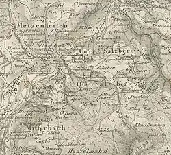 Weitere bzw. exaktere Angaben u. a. zu seiner Geomorphologie fehlen hingegen bislang. Darüber hinaus ist derzeit nur noch nachzuweisen, dass sich auf dem Salzberg von den sechs oben aufgeführten Gnotschaften lediglich die „Ansiedlungen Unter- und Obersalzberg“ verteilt haben[3] – die Bezeichnung dieser Ansiedlungen aber nicht mit gleichnamigen Erhebungen bzw. Gipfeln des Salzbergs gleichzusetzen sind. So zitiert auch Wolf-Armin von Reitzenstein in seinem Lexikon bayerischer Ortsnamen (2006) einzig unter dem Stichwort Obersalzberg ein geographisches Lexikon von 1832, worin es heißt: „Salzberg, Name jener Gegend im Ldg. Berchtesgaden, rechts der Achen, welche auf dem Berge gleiches Namens, den dieser von seinen Eingeweiden hat, sich ausbreitet, eine Gemeinde bildet und mehrere Einöden enthält, welche in Ober- und Unter-Salzberg abgetheilt sind.“[34] Stichworte zu „Untersalzberg“ und „Salzberg“ auch nur mit Verweisen nach „Obersalzberg“ werden in diesem Lexikon bayerischer Ortsnamen nicht angezeigt.