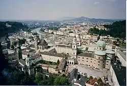 Die Kritik an der autoritären Macht des Erzbischofs nahm unter Keutschach weiter zu. 1525 belagerten aufständische Knappen und Bauern die Festung Hohensalzburg, in der sich Erzbischof Matthäus Lang von Wellenburg verschanzt hatte. Erst mit Hilfe von erkauften Truppen des Schwäbischen Bundes konnten die Aufständischen zum Rückzug gezwungen werden. Das Erzstift zählte um 1600 durch Salz- und Goldbergbau zu den reichsten Fürstentümern im römisch-deutschen Reich. Damals gestaltete Erzbischof Wolf Dietrich von Raitenau den Altstadtkern neu.[16] Der große spätromanische Dom wurde abgerissen und durch Markus Sittikus im frühbarocken Stil wieder aufgebaut.[17]