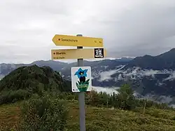 Als Kennzeichen und Markierung des Salzburger Almenweges dient die blaue Pflanze des Alpen-Enzians mit dem Schriftzug Salzburger Almenweg.