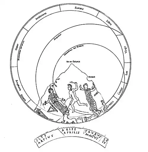 - ↑ Dass hier Tierkreiszeichen und nicht Sternbilder dargestellt wurden, ist daran zu sehen, dass die Zeichen gegenüber den Sternbildern entsprechend der durch die Präzession der Erdachse verursachte Wanderung des Frühlingspunktes verschoben dargestellt sind.