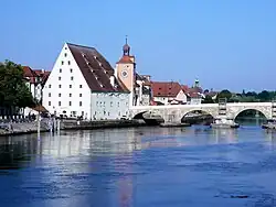 - ↑ Baudenkmäler Regensburg. (pdf) Bayerisches Landesamt für Denkmalpflege, S. 143, abgerufen am 8. August 2014: „Ehem. städtischer Salzstadel, dreigeschossiges und traufständiges Lagerhaus mit abgewalmtem Satteldach zu fünf Speichergeschossen, über unregelmäßigem Grundriss, Erdgeschoss durch Sandsteinpfeiler in drei Schiffe unterteilt, darüber mächtige Holzkonstruktionen, 1616-20; zusammen mit Brückentorturm, 14. Jh.; siehe unter Brückstraße 2.“