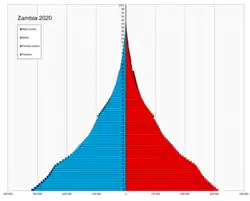 Sambia hatte 2023 20,7 Millionen Einwohner.[14] Das jährliche Bevölkerungswachstum betrug + 2,8 %. Zum Bevölkerungswachstum trug ein Geburtenüberschuss (Geburtenziffer: 34,1 pro 1000 Einwohner[15] vs. Sterbeziffer: 6,7 pro 1000 Einwohner[16]) bei. Die Anzahl der Geburten pro Frau lag 2022 statistisch bei 4,2.[17] Die Lebenserwartung der Einwohner Sambias ab der Geburt lag 2022 bei 61,8 Jahren[18]. Der Median des Alters der Bevölkerung lag im Jahr 2021 bei 16,9 Jahren.[19] Im Jahr 2023 waren 42,0 Prozent der Bevölkerung unter 15 Jahre,[20] während der Anteil der über 64-Jährigen 1,9 Prozent der Bevölkerung betrug.[21] Die staatliche Zuständigkeit für die Aufgaben der landesweiten amtlichen Statistik liegt bei der Zambia Statistics Agency.