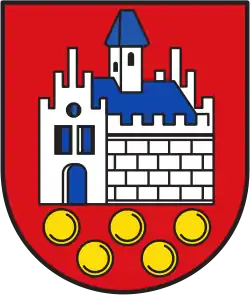 Blasonierung: „Im roten Feld über fünf (3:2) goldenen Kugeln im Schildfuß ein silbernes Haus mit fialenbesetzten Stufengiebeln und mit Zinnen über der gequaderten Traufseite vor blauem Dach; auf dem First ein blaubedachter Turm.“