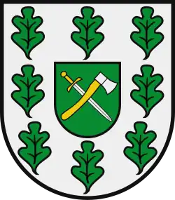 Blasonierung: „In Silber ein grünes Herzschild, darin schräg gekreuzt ein silbernes Schwert mit goldenem Knauf durchkreuzt von einer silbernen Axt mit goldenem Stiel, beseitet von acht grünen Eichenblättern.“