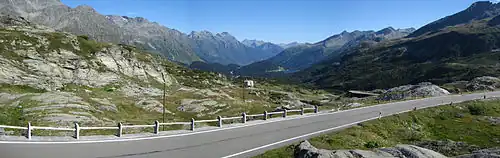 Der San-Bernardino-Pass (dt. wenig gebräuchlich auch Sankt-Bernhard(in)pass oder kurz (Sankt) Bernhard(in)pass, ital. Passo del San Bernardino, rätoromanisch Pass dal Sogn Bernardin) ist ein Gebirgspass im schweizerischen Kanton Graubünden mit einer Scheitelhöhe von 2066 m ü. M.[1] Er verbindet die Täler Rheinwald auf der nördlichen und Misox auf der südlichen Seite an der Hauptstrasse 13 und trennt die westlich liegenden Adula-Alpen von der Tambogruppe im Osten. Die Luftdistanz zu den Passfussorten beträgt vier Kilometer bis Hinterrhein (auf 1620 m gelegen) und 12 km bis Mesocco (790 m). Auf der Passhöhe verlaufen die Europäische Hauptwasserscheide und die Sprachgrenze zwischen Deutsch und Italienisch.