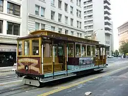 Bei den Kabelbahnen von San Francisco läuft das Seil in einem Graben unterhalb der Straße. Die Wagen greifen mit einer Spannklaue durch einen Schlitz in der Fahrbahn das Seil. Das Seil ist endlos umlaufend. Am Ende einer Linie wird der Wagen auf einer Drehscheibe gedreht und kann auf dem Gegengleis mit dem rücklaufenden Seil zurückfahren. Im Streckennetz von San Francisco gibt es vier Drehscheiben, je eine an den Endhaltestellen Powell/Market, Taylor/Bay und Hyde/Beach sowie eine im Depot an der Kreuzung Mason/Washington. Die Wagen dieser Strecken sind alle genau gleich aufgebaut: zwei Drehgestelle mit je zwei Achsen, Länge über alles 8,4 Meter (27 Fuß 6 Zoll) Breite über alles 2,4 Meter (8 Fuß) und 7030 Kilogramm (15.500 Pfund) schwer mit einer Kapazität von 60 Passagieren, davon 29 Sitzplätze. Die Farbgebung ist jedoch nicht einheitlich, sondern sie erinnert an verschiedene Epochen und verschiedene Betreibergesellschaften.