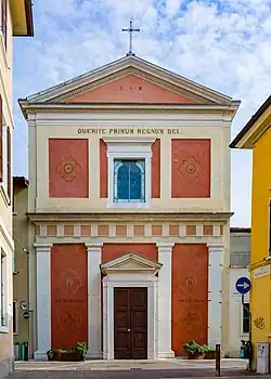 Die Fassade wurde so positioniert, dass die östliche Seite der Via Monti nach einer nicht zufälligen, sondern gewünschten und während des Baus der Kirche, am Ende des 16. Jahrhunderts, entstandenen Perspektive geschlossen wurde, wobei die Mauern eines davor liegenden Privatgartens abgerissen wurden. An diese Aktion erinnert noch heute eine Tafel an der Nordwestecke des Gebäudes. Das aktuelle Aussehen der Fassade ist weitgehend auf die Restaurierung der zweiten Hälfte des 19. Jahrhunderts zurückzuführen: nüchtern und klassisch, sehr flach, in zwei Ordnungen unterteilt, wobei die erste von vier dorischen Lisene und einem dorischen Gebälk geschmückt ist, während die zweite nur gemalten Tafeln mit sakralen Symbolen aufweist. Auf der Mittelachse befindet sich an der Basis ein Eingangsportal aus Marmor, das von einem kleinen dreieckigen Tympanon überragt wird, das einzige wirklich vorspringende Element der Fassade, während sich in der oberen Reihe ein großes rechteckiges Fenster befindet, über dem eine Inschrift mit der Widmung der Kirche und ein dreieckiges Tympanon, welches die Fassade abschließt.