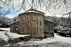 Auf einer höher gelegenen Terrasse liegt die schmucklose Taufkapelle. Der seitliche Zugang eines Vorraums führt zu der im Grundriss quadratischen Kapelle, die kleeblattartig an drei Seiten Apsiden aufweist. In der mittleren, der östlichen Apsis ist eine schmale Fensteröffnung ausgespart.