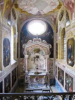 In der fünften Kapelle ist ein Grabmonument einer Äbtissin des Klosters aus dem 15. Jahrhundert, links ein Seiteneingang zur Kirche und rechts der Zugang zur Sakristei. Die Decke der letzteren ist mit einer Anbetung des Allerheiligsten Sakraments von Paolo De Matteis von ca. 1712 geschmückt.[7]