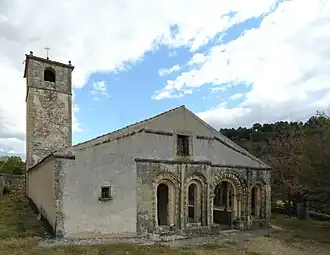 Ob das Obergeschoss des auf der Nordseite befindlichen Glockenturm zum Originalbestand der Kirche gehört, ist fraglich, denn es ist durch ein umlaufendes Gesims vom Untergeschoss abgetrennt und zeigt besser bearbeitete Steine, aber nur ungegliederte und undekorierte Schallöffnungen, wie sie im 18. Jahrhundert in ländlichen Gegenden üblich sind. Die aufgesetzten Kugeln können in jedem Fall als entfernte Reminiszenz an den Escorial verstanden werden.