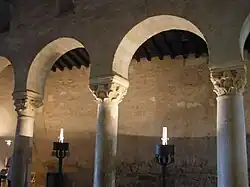 Hufeisenbögen finden sich auch im Inneren, bei den Fensteröffnungen, dem Triumphbogen und den Bogenstellungen zwischen den Seitenschiffen und dem Mittelschiff. Letztere werden von Säulen aus grauem, beigem und rosa Marmor getragen und sind Spolien aus römischer Zeit. Von den Kapitellen ist eines ebenfalls eine römische Spolie in korinthischem Stil, alle anderen sind westgotische Nachahmungen.