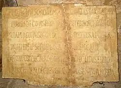 „Vorläufer des Herrn, Märtyrer, Täufer Johannes, nimm als ewige Gabe diese für dich gebaute Basilika, die ich, Ergebener, König Rekkeswinth, selbst Verehrer deines Namens, dir zugeeignet habe, ich habe sie erbaut und ausgestattet auf meine Kosten und auf dem Gebiet meines eigenen Erbes im Jahre 699, im zehnten Jahr der Herrschaft meines Vaters Chindaswinth und nach drei Jahren meiner Mitregentschaft.“