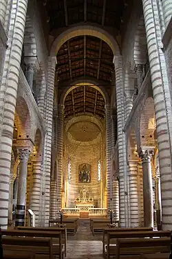 Das Mittelschiff ist von den Seitenschiffen durch zwei Säulenreihen getrennt, die jeweils aus vier massiven abgerundeten kreuzförmigen Säulen aus rotem Mauerwerk und weißem Tuff bestehen, die sich über die Empore hinaus in der Höhe verlieren und mit halbrunden Lisenen umgeben sind. Zwischen den kreuzförmigen Säulen stehen kleinere runden Säule, deren Kapitelle römischen Ursprungs sind, während die Kapitelle der Säulen im Querschiff zur Zeit der Karolinger entstanden sind und mit stilisierten Adlern dekoriert sind. Emporen und Seitenschiffe besitzen jeweils Kreuzgewölbe.[16] Das ursprüngliche Kreuzgewölbe des Hauptschiffs wurde im 15. Jahrhundert durch Tonnengewölbe ersetzt. Nach dem Einsturz des Daches im Zweiten Weltkrieg wurde ein Gewölbe aus Stahlbeton eingesetzt, das als Holzgewölbe maskiert ist.[18]