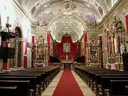 Die einschiffige Saalkirche ist etwas mehr als 47 m lang, wovon allein das Kirchenschiff über 31 m lang ist. Sie misst fast 17 m in der Breite und etwas mehr als 17 m in der Höhe. Links des Eingangs befinden sich die zwischen dem 18. und 19. Jahrhundert errichteten drei Seitenkapellen, die der Kirche ein asymmetrisches Aussehen verleihen, während auf der gegenüberliegenden rechten Seite drei Seitenaltäre aus mehrfarbigem Marmor den Kirchensaal schmücken. Der Chorbogen zeigt links, wie die Bewohner der Stadt im August 1703 während des Spanischen Erbfolgekrieges die Jungfrau Maria um Schutz vor den anrückenden brandschatzenden Franzosen unter General Vendôme bitten. Auf der rechten Seite des Chorbogens ist die Marienprozession abgebildet, die man zum Dank abgehalten hat und die nach wie vor am 5. August jeden Jahres stattfindet. In der Mitte des mit zahlreichen Stuckarbeiten geschmückten Tonnengewölbes befindet sich ein weiteres Bildnis des Evangelisten Markus.[9]