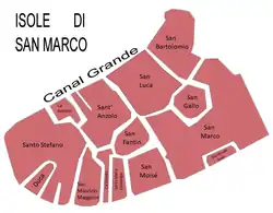 San Marco ist einer der sechs Stadtteile (Sestieri) der Altstadt Venedigs. Das Stadtsechstel erstreckt sich über eine Fläche von 34 Hektar.[1] Es gilt als geistiger und politischer Mittelpunkt, da dort die Regierung und Verwaltung der Republik Venedig ihren Sitz im Dogenpalast und den Bauten am Markusplatz nahmen. San Marco hat einschließlich der Insel San Giorgio Maggiore 3.552 Einwohner (Stand 31. Dezember 2024),[2] die sich auf die vier Pfarreien San Moisè (mit der Kirche Santa Maria Zobenigo), Santo Stefano, San Luca und San Salvador (mit den Kirchen San Bartolomeo und San Zulian) verteilen.