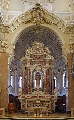 Unter dem Chorbogen erhebt sich der monumentale Hauptaltar aus polychromem Marmor, der 1773 errichtet wurde. Die harmonische Gestaltung des Komplexes zeigt klassizistische formale Lösungen, die in der künstlerischen Sprache des späten Rokokos gelöst sind. Auf dem Altarsockel erheben sich vier Säulen mit reich verzierten Kapitellen.