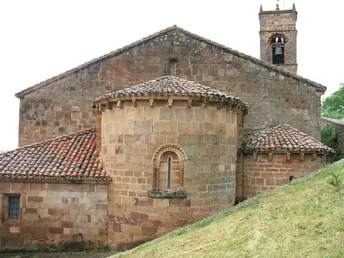 - Das dem hl. Aemilianus von Cogolla geweihte Kloster San Millán wurde wahrscheinlich bereits im 10. Jahrhundert von Mozarabern gegründet, doch in der 2. Hälfte des 12. Jahrhunderts im romanischen Stil komplett neugebaut. Aus dem ansonsten schmucklosen Äußeren der Klosterkirche stechen das schmale, von kleinen Säulen begleitete Apsisfenster und die beiden leicht aus der Mauerflucht hervortretenden Archivoltenportale hervor. Das dreischiffige Innere wird von einem offenen Dachstuhl überspannt. Im Untergeschoss des an den Berghang gebauten Glockenturmes (campanario) befindet sich eine Tür mit Vielpassbogen, die in einen möglicherweise ehemals von Eremiten genutzten Raum führt.[6]