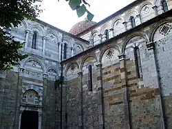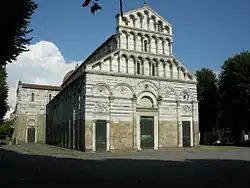 Die Fassade ist zweigeschossig und im Untergeschoss fünfachsig errichtet. Im Untergeschoss verraten die sehr unterschiedlichen Blendbögen, wie auch andere Teile der Fassade, Einflüsse außerhalb der toskanischen Romanik: die beiden rechten Bögen enthalten unter leicht spitzbögigem Abschluss Zackenrahmen, was auf süditalienisch-normannische Vorbilder hinweist[5], während die übrige Gestaltung mit den gestreiften Marmorinkrustationen und den Rauten bzw. Rundfenstern der Pisaner Romanik entspricht. Auch die drei Portale sind mit Blendbögen verziert, abermals mit Rautenfenstern, das mittlere Portal enthält einen tief gesetzten Rundbogen. Oberhalb des oberen Blendbogens des mittleren Portals sind zwei kleine Bildhauerarbeiten eingefügt, das linke Relief ist eine Darstellung Mariens unter byzantinischem Einfluss. Die Pilaster, die die Bögen tragen, folgen in den Kapitellen der korinthischen Ordnung, die Basis der mittleren Blendbögen bilden Löwenköpfe. Das Gesims, auf dem der Giebel aufsitzt, ist mit einem Zahnfries und darüber reichen floralen Ornamenten verziert, auch kleine Tierfiguren sind eingearbeitet, wobei auch hier wieder die völlige Verschiedenheit des Gesimses beiderseits der Fassadenmitte auffällt. Der Giebel ist im Verhältnis zur Höhe des Mittelschiffs deutlich überhöht ausgeführt. Er besteht aus drei übereinander gestellten Galerien mit Säulchen unter Bögen, teilweise als Spiralsäulen gearbeitet. Den Einfluss des Domes verrät das Fehlen der Bögen in der untersten Reihe in den Giebelansätzen außen, so wurden auch die Giebelansätze am Dom gearbeitet[6]. Die Kapitelle der Säulchen sind abermals höchst unterschiedlich. In die Hinterwand der untersten Galerie sind zwei kleine Rundbogenfenster eingelassen, in die mittlere darüber nochmal mittig eines.