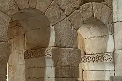 In Höhe der Kämpferzone über den Kapitellen verläuft ein reliefiertes Schmuckband, welches auch die Apsis und das Querhaus miteinschließt; die hier verwendeten Formen sind vielfältig und umfassen sowohl menschliche als auch tierische, pflanzliche und geometrische Motive (Köpfe, Vögel, Weinranken, Kreuze, Wirbel etc.). Bemerkenswert sind die Fächerrosette oberhalb des Apsisfensters und dessen Rahmung in Form eines Alfiz.