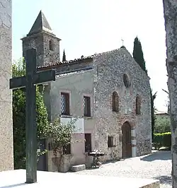 Die bis auf die teilweise und unregelmäßige Eckquaderung unverzierte Fassade wird oberhalb des Portals mit einem kleinen Rechteckfenster nur von zwei Rundbogenfenstern mittig sowie einem Rundfenster unterhalb des Giebelansatzes durchbrochen. Der linke Anbau ist deutlich jünger, er stammt aus dem 19. Jahrhundert. Der Campanile mit dem pyramidenförmigen Turmhelm wurde etwa 1070 errichtet.