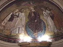Von dem um 600 entstandenen Mosaik in der Apsis des späten 6. Jahrhunderts blieb die Komposition bis heute erhalten; restauriert wurden um 1642 unter Kardinal Francesco Barberini vor allem das Haupt Christi, die Hand des Paulus, der jugendliche Heilige neben Paulus sowie der Goldgrund und die Zierleiste.[7] Das Mosaik zeigt Christus mit Segensgestus, Kreuznimbus und Kreuzstab auf einer sternenbesetzten Weltkugel thronend; er trägt ein schwarzes Gewand mit goldenem Laticlavius, dem Symbol für einen hohen Status in der römischen Gesellschaft. Über ihm kommt die Hand Gottvaters mit Lorbeerkranz aus bunten Wolken. Auf der rechten Seite führt Petrus (mit Schlüssel) den Märtyrer Theodor (mit gemustertem Umhang) zu Christus, links geleitet Paulus (mit Schriftrolle) einen jungen Heiligen (Georg?).