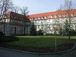 Hauptgebäude und altes Pförtnerhäuschen des Krankenhauses an der Hubertusstraße (März 2008)