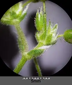 Die zwittrigen Blüten sind radiärsymmetrisch und fünfzählig mit doppelter Blütenhülle. Die fünf Kelchblätter sind bei einer Länge von 3 bis 5 Millimetern lanzettlich mit spitzem oberen Ende, breit hautrandig, kurz und am Rand drüsig behaart und an der oft gezähnelten Spitze kahl.[3] Die fünf weißen Kronblätter sind nur auf etwa 1/8 der Länge ausgerandet und sind kürzer als die Kelchblätter. Es ist nur ein Kreis mit fünf fertilen Staubblättern vorhanden, die halb so lang wie die Kronblätter sind.[3]