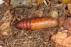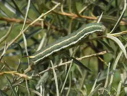 Die Raupen werden 75 bis 80 Millimeter lang. Anfangs sind sie blassgrau und haben je eine weiße Längslinie an den Seiten des Rückens. Ihr Analhorn ist grau. Mit zunehmender Entwicklung verfärben sich die Tiere dunkelgrün und sind stark mit weißen und dunkelgrauen Punkten versehen. Im letzten Stadium tritt eine Reihe verschiedener Farbformen auf. Hauptsächlich sind die Tiere dunkelgrün und gelegentlich pink schattiert. Sie sind kräftig weiß und grau gesprenkelt und tragen dorso-lateral cremefarbene Längslinien. Diese Linien umfassen häufig orange Augenflecken. Eine weitere, weiße, ventro-laterale Längslinie verläuft direkt über den Beinen. Das lange, dünne Analhorn ist basal orange, ansonsten schwarz. An der Basis trägt es außerdem zwei orange, langgestreckte Flecken. Der Kopf ist grün und trägt zwei braune Linien. Seltener sind die Raupen silbergrau und tragen eine schwarze, unterbrochene dorso-laterale Längslinie von der schwarze, ebenso unterbrochene, schräge Seitenstreifen ausgehen. Dazwischen liegen häufig weiße, rote oder gelbe Flecken. Der Kopf ist braun und grau, das Analhorn ist farblich gleich wie das der häufigeren Form. Sehr selten findet man Raupen, bei denen die grüne Farbe entweder durch Pink-braun oder ein dunkles Grauschwarz ersetzt ist. Letztere Form tritt insbesondere bei kalten Bedingungen auf. Es gibt auch Individuen, die keine Längsstreifen aufweisen.[2]