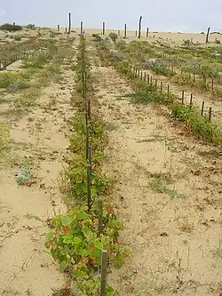 Aus der Küstenluft fangen sich Meeresaromen und Meersalz in der fettigen Schicht auf den Trauben, was dem Sandwein seinen charakteristischen Geschmack verleiht. Da im Sandboden die Wurzeln nicht von der Reblaus angegriffen werden, können die europäischen Reben kultiviert werden, ohne auf robuste Reben aufgepfropft zu werden.[1]