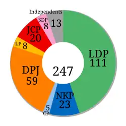 | Demokratische Partei (DPJ) | 33 | 10.066.552 | 18,53 % | 18 | 8.990.524 | 16,42 % | 8 | 26 | 59 | |