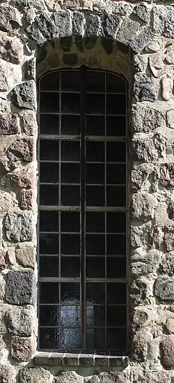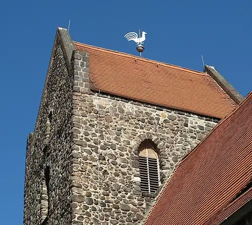 Über der Traufhöhe des Schiffs wird das Feldsteinmauerwerk des Turms unregelmäßiger und kleinteiliger. Eckquader stabilisieren die Kanten. Ungewöhnlich für Kirchbauten des 13. Jahrhunderts ist, dass der Turm in der Breite gegenüber dem Schiff um 0,8 Meter zurückgenommen ist. Der Grund hierfür ist nicht bekannt.[11] In der Westfassade des Turms befindet sich eine schmale, leicht rundbogige Pforte, heute der einzige Zugang zum Kirchengebäude. Neben der Pforte sind beidseitig je ein Findling an die Wand gelehnt. Bis auf zwei Schallluken unter dem Dach ist die breite Westfassade ansonsten fensterlos. Die gegenüberliegende Ostseite weist je eine Schallluke zu beiden Seiten und auf Höhe des Dachfirstes des Schiffs auf. In die schmale Nord- und Südfassade sind je vier spitzbogige Öffnungen eingelassen, die übereinander angeordnet sind: auf zwei sehr enge Fenster folgt eine etwas breitere Schallluke und darüber wieder ein enges Fenster, das bis an die Traufhöhe des Dachs reicht. Die Nordfassade ist zusätzlich unter der Schallluke mit einer Uhr mit römischem Zifferblatt ausgestattet. In sämtliche Schallfenster sind Klanglamellen eingefügt, um die Glockenstube vor eindringendem Schlagregen zu schützen.