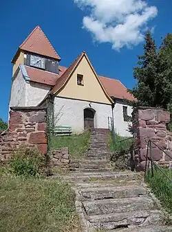 Die auf einer Erhebung über dem Dorf gelegene, aus Bruchsteinen errichtete Kirche geht in ihrem Kern auf die Romanik zurück und wurde in der Zeit um 1500 nach Osten erweitert. Im 18. Jahrhundert und im Jahr 1908 erfolgten Umbauten. Die Kirche ist einschiffig und verfügt über einen dreiseitigen Ostschluss. Am Polygon befinden sich drei kleine spätgotisch verzierte Vorhangbogenfenster, die übrigen Kirchenfenster sind länglich rechteckig gestaltet. Oberhalb des Westgiebels befindet sich ein hölzerner Turmaufsatz mit querrechteckigem Grundriss, der von einem Zeltdach bedeckt wird. Auf der Südseite befindet sich ein Vorbau. Darüber hinaus befindet sich in der südlichen Wand ein zweiteiliges, romanisches Tympanon. In der Nordwand ist eine vermauerte Pforte aus der Zeit der Spätgotik zu erkennen.