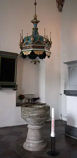 Der schlicht gestaltete romanische Taufstein der Kirche ist aus grünem Kalkstein gefertigt und entstand bereits im 12. Jahrhundert. Oberhalb der Taufe hängt ein bemalter und beschnitzter hölzerner Baldachin aus dem 17. Jahrhundert.