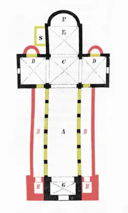 Die heutige Sakristei an der Nordseite des Chors entstand während oder nach dem Wiederaufbau, da sich ihr Grundriss zu früherer Zeit mit der Nebenapsis am nördlichen Querschiff überschnitten hätte.[1]