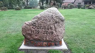 ![]() Der Sockel des Gedenksteins, der am 13. September 2019 anlässlich des Dorfjubiläums aufgestellt wurde, besteht teilweise aus alten Ziegelsteinresten der Sannauer Kirche