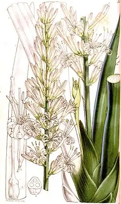 Die einfachen, ährigen Blütenstände sind 60 bis 90 Zentimeter hoch. Die 38 bis 75 Zentimeter großen Rispen sind mit fünf bis sechs Blüten pro Büschel besetzt. Das Tragblatt ist lanzettlich oder eiförmig-lanzettlich und 4 bis 8,5 Millimeter lang. Die Blütenhüllblätter sind schneeweiß oder oft auch leicht rosa. Sie haben eine 1,7 bis 2,5 Zentimeter lange Blütenröhre.
