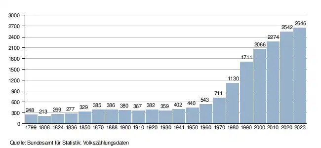 - ↑ Daten der Eidgenössischen Volkszählungen ab 1850 nach Gemeinden. (XLSX; 10 MB) Bundesamt für Statistik, Neuchâtel, 12. Juli 2024, abgerufen am 26. April 2025 (Öffnung in Excel nur über "Anhang/Excel-Datensatz" möglich).